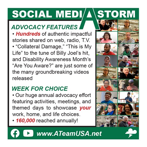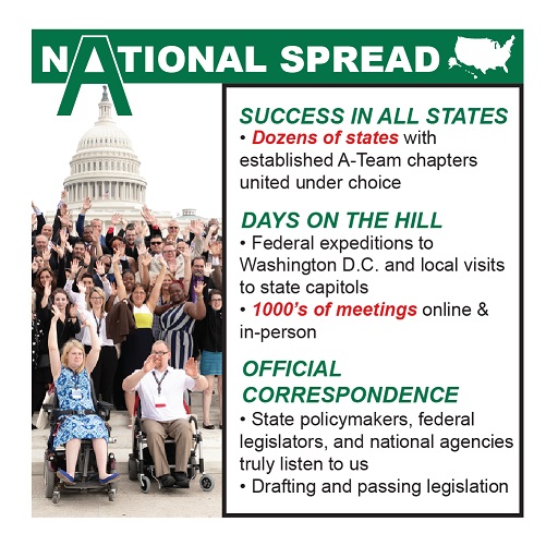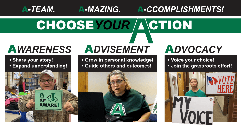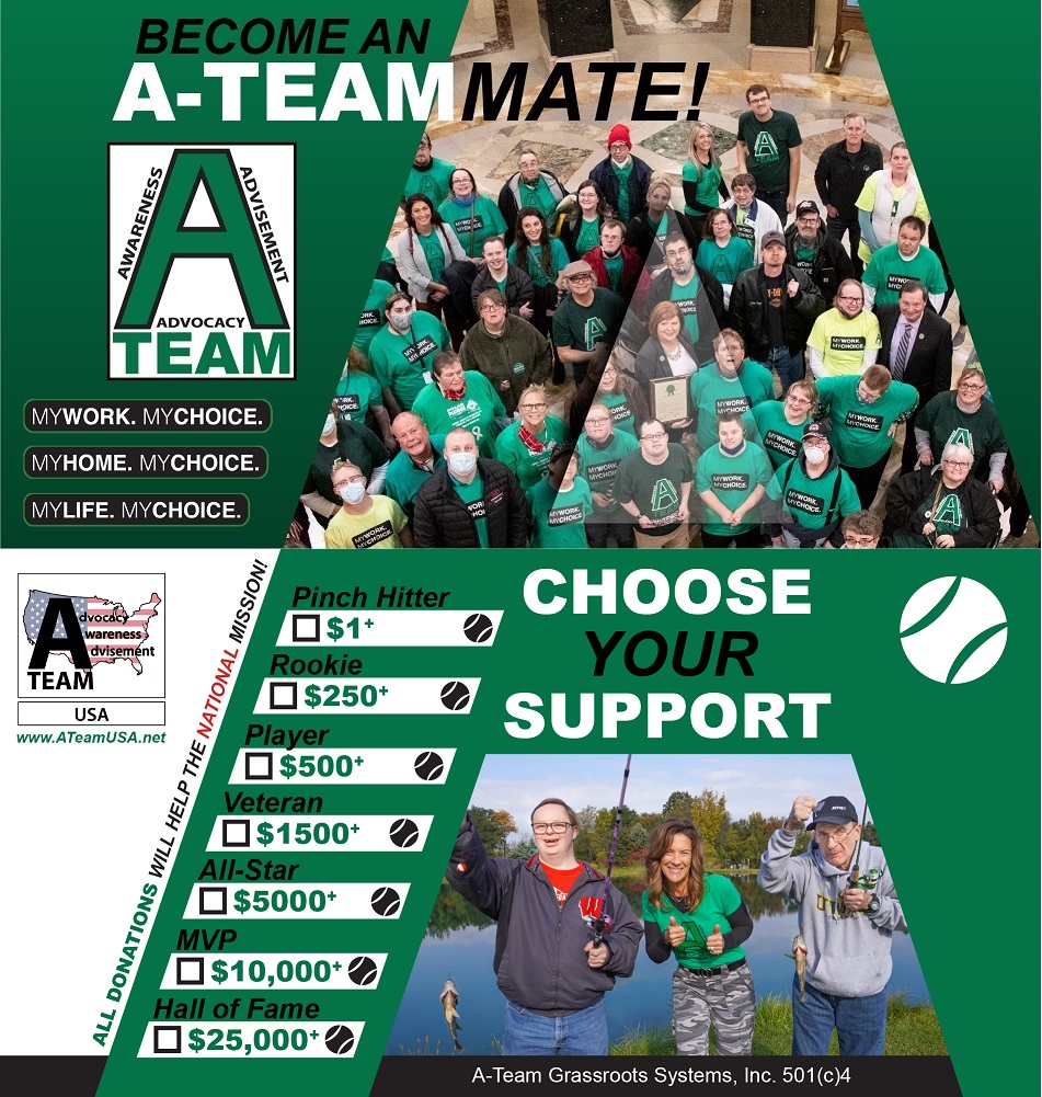 Donate online now! and join families in advancing advocacy, moving forward to ensure service options and a full array of choices continue for individuals with diverse abilities! If you’d like to pay by mail, fill out the form and send to P.O. Box 278, Fort Atkinson WI 53538. Checks may be made payable to A-Team Grassroots System, Inc. 501(c)(4).